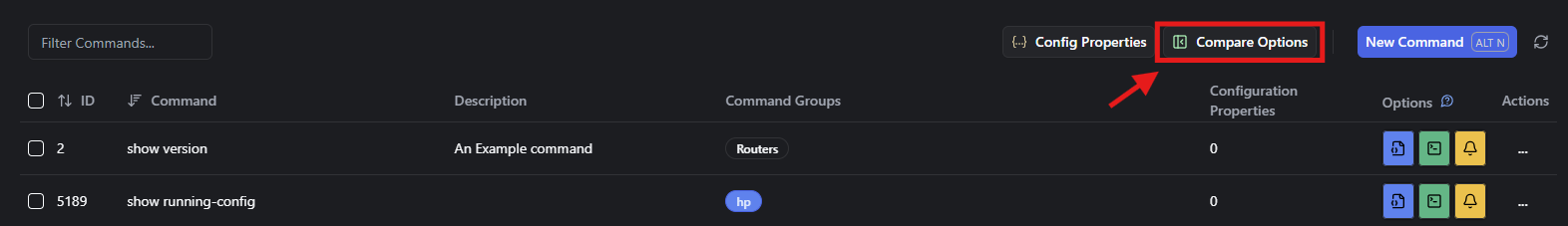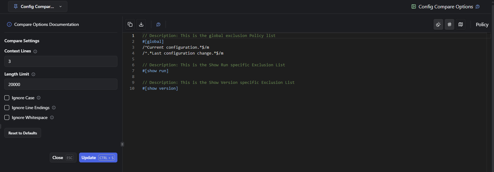 Section titled “Compare Options”You can configure the compare options for each command. This allows you to specify how rConfig should compare the output of the command. You can configure the following options: Compare exclusions Compare exclusions allow you to specify lines of text that should be excluded from the comparison. This is useful if you have commands that return dynamic information, such as timestamps, that you want to exclude from the comparison. You can specify multiple lines of text to exclude, and rConfig will exclude these lines from the comparison.