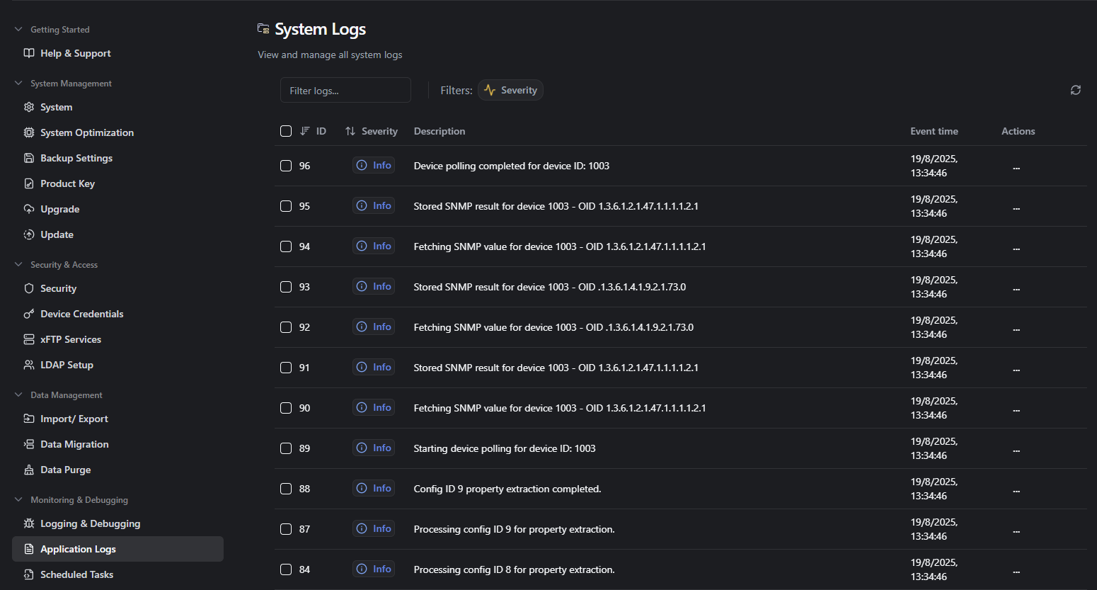 Section titled “Viewing SNMP Polling Logs”All events related to SNMP Polling for each device, polling group, and OID are stored in the Application Logs under Settings. Use these logs for troubleshooting and verification.