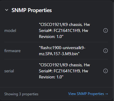 Section titled “How it Works”Once the device is part of an SNMP Polling Group, all associated OIDs will be polled for value data during each configuration backup or download for the device. These properties are stored in the database, but only the latest retrieved results are displayed in the UI and Inventory Reports.