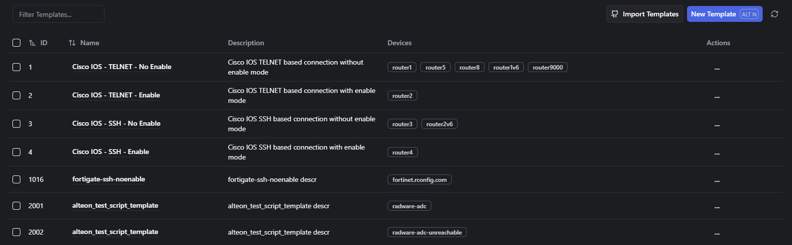 Device Connection templates are used to specify connection and CLI settings for device types, when rConfig attempts to connect to devices. Lets go over some rules for templates;