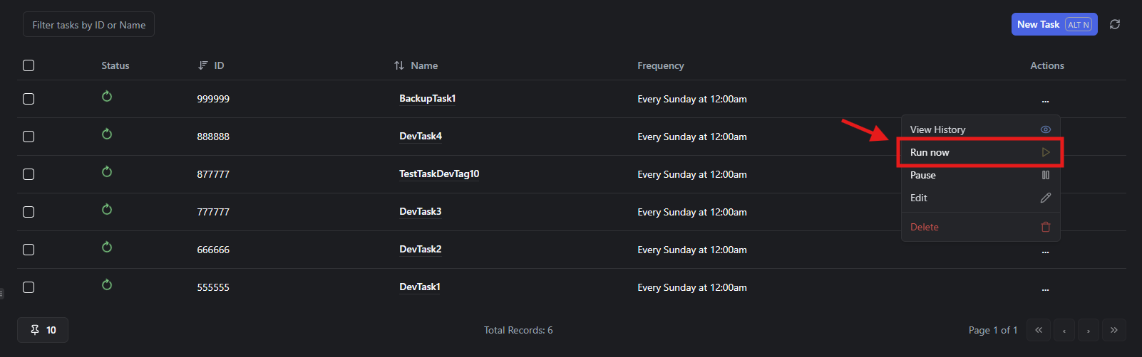 Section titled “Tasks Main View”You can run tasks manually from here. Click “Run now” on any task to run it. View its progress from the Horizon Queue Manager.
